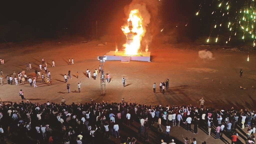 महावीर सेवादल के तत्वावधान में चल 9 दिवसीय चैत्र नवरात्र महोत्सव मेले का समापन शनिवार को विजयादशमी पर्व पर राडी के बालाजी स्थित दशहरा मैदान में रावण के पुतले के दहन से हुआ। अहंकार के प्रतीक का रावणपुतला 2 मिनट में ही जलकर खाक हो गया। राडी के बालाजी मंदिर के पास दशहरा मैदान में रावण दहन देखने के लिए लोगों की भीड़ उमड़ी। यहां मेलेजैसा माहौल रहा। राम जानकी की शोभायात्रा के मैला मैदान पहुंचने पर मुख्य अतिथि कलेक्टर अजय सिंह राठौड़और एसपी अमित कुमार बुड़ानिया ने पूजन किया। इसके बाद राम लक्ष्मण ने तीर चलाकर रावण पुतले का दहनकिया। 35 फीट के रावण का पुतला 2 मिनट में ही जलकर खाक हो गया। विजयादशमी पर्व पर पुतला दहन से पूर्वछबड़ा के शोरगरों ने लंका दहन का प्रदर्शन किया। इस मौके पर महावीर सेवादल के अध्यक्ष संजय जैन,भाजपा जिला उपाध्यक्ष सीएम धाभाई, राजकुमार सोनी, भूपेंद्र शर्मा, लोकेश व्यास, जितेंद्र टेलर, अनिल कसेरा, बंटी खंडेलवाल, वीरेंद्र सोगड़िया, अंकुर पटवा मौजूद रहे।